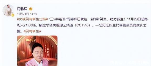 11月25号那天,阎鹤祥自己在网上发了张照片,是中央电视台的官宣海报。照片上的他穿着笔挺的西装,看着特别精神,旁边清清楚楚写着,他要去央视综艺频道,给一档叫《笑有新生》的节目当嘉宾主持。